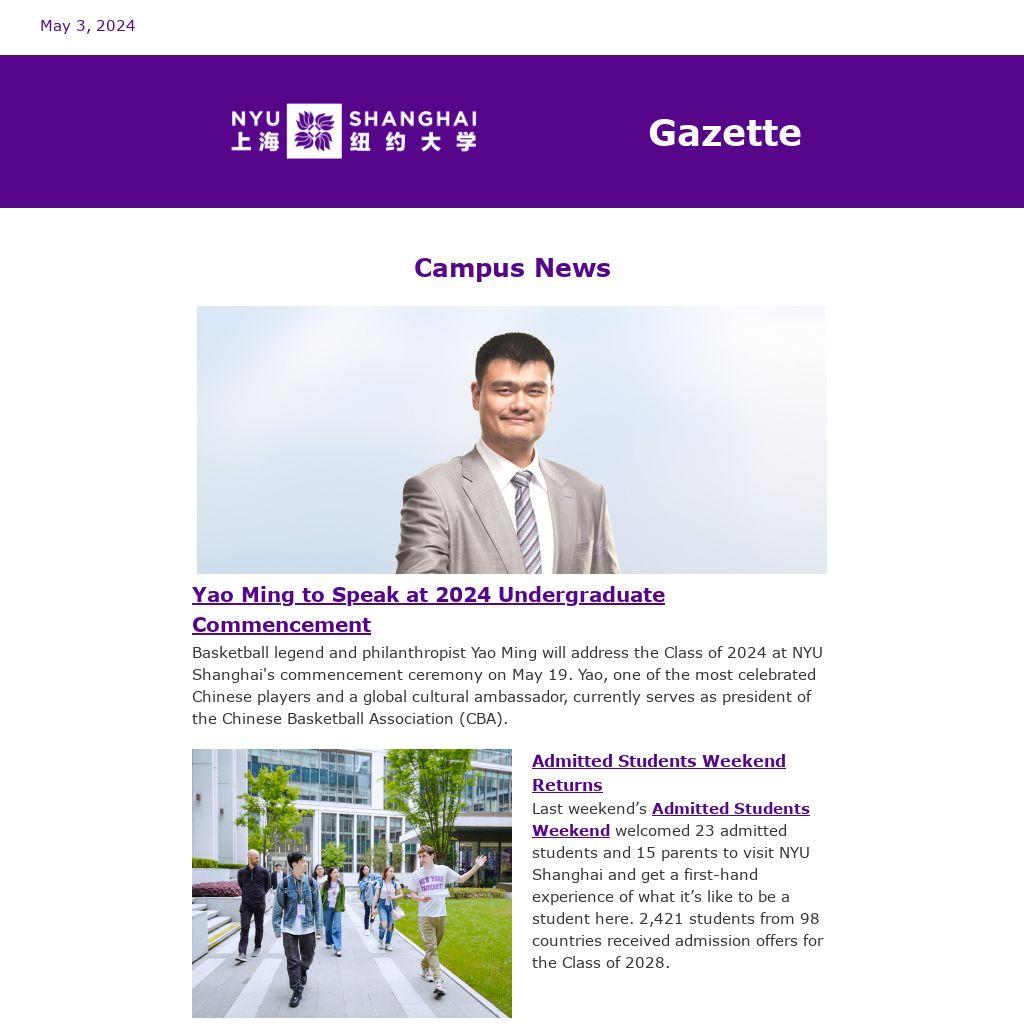Basketball legend and philanthropist Yao Ming will address the Class of 2024 at NYU Shanghai's commencement ceremony on May 19. Yao, one of the most celebrated Chinese players and a global cultural ambassador, currently serves as president of the Chinese Basketball Association (CBA).