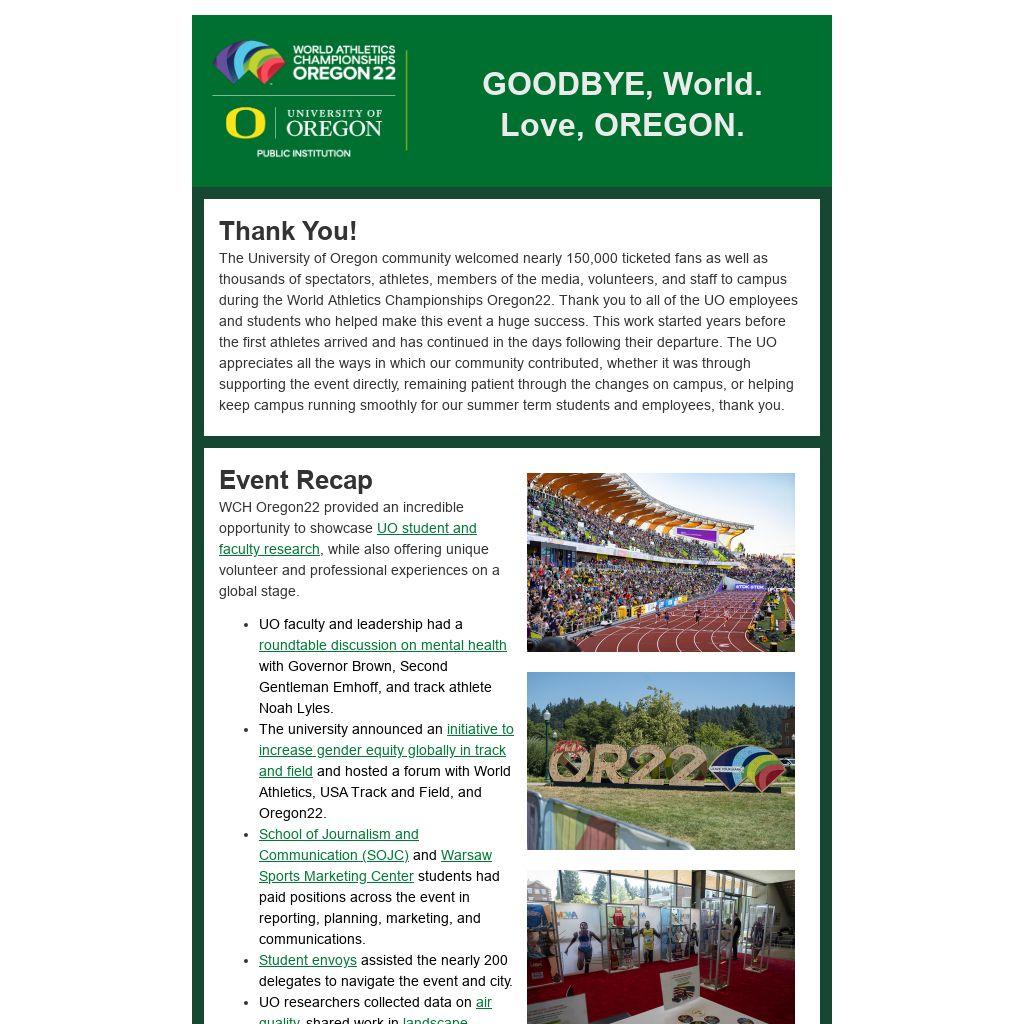 The University of Oregon community welcomed nearly 150,000 ticketed fans as well as thousands of spectators, athletes, members of the media, volunteers, and staff to campus during the World Athletics Championships Oregon22. Thank you to all of the UO employees and students who helped make this event a huge success. This work started years before the first athletes arrived and has continued in the days following their departure. The UO appreciates all the ways in which our community contributed, whether it was through supporting the event directly, remaining patient through the changes on campus, or helping keep campus running smoothly for our summer term students and employees, thank you.