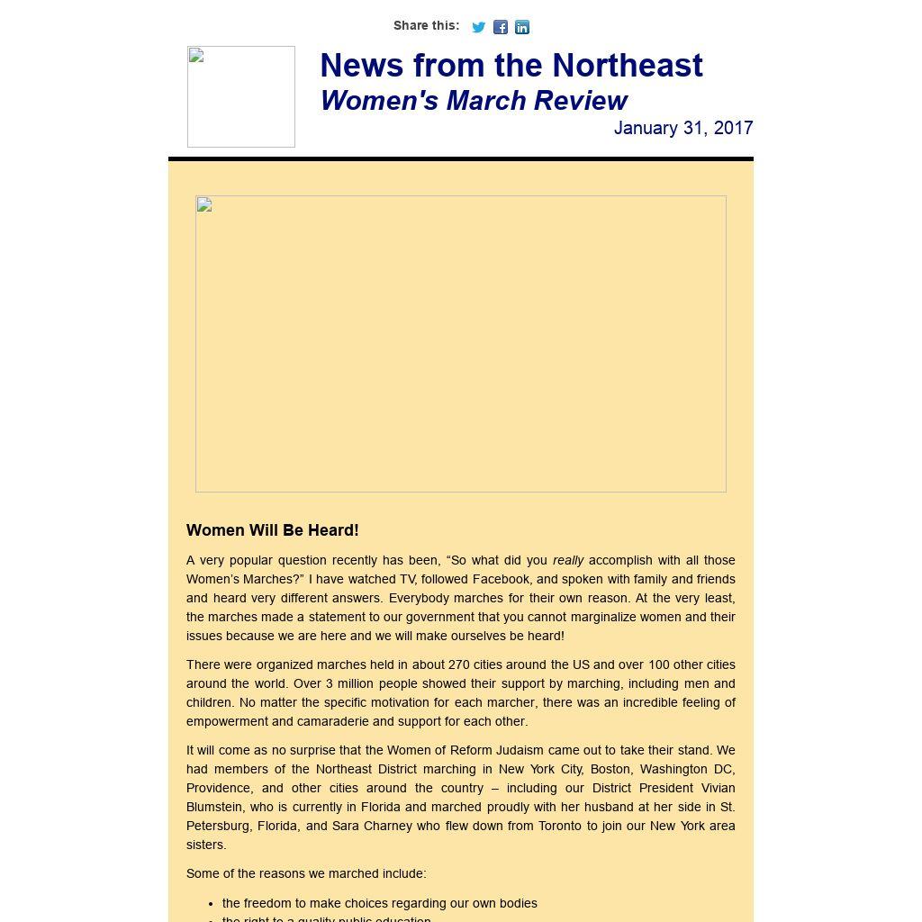 It will come as no surprise that the Women of Reform Judaism came out to take their stand. We had members of the Northeast District marching in New York City, Boston, Washington DC, Providence, and other cities around the country – including our District President Vivian Blumstein, who is currently in Florida and marched proudly with her husband at her side in St. Petersburg, Florida, and Sara Charney who flew down from Toronto to join our New York area sisters.