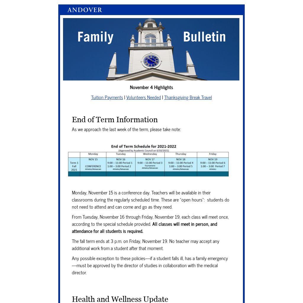 Please check the Events Calendar on Andover’s website regularly for additional in-person and online events that may be open to families. The Weekender, the Academy’s one-stop guide to weekend student activities, opportunities, club-organized events, guest speakers, performances, and athletic contests, is posted on The Hive.