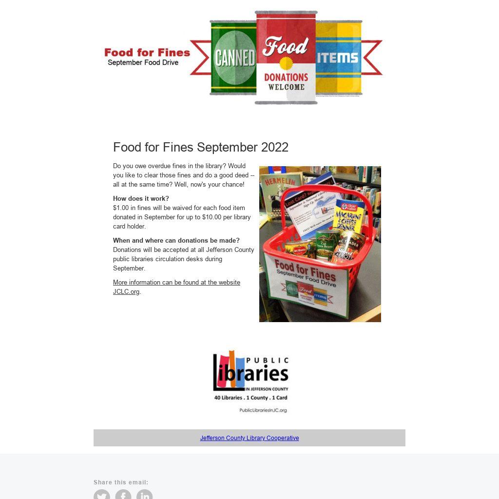 $1.00 in fines will be waived for each food item donated in September for up to $10.00 per library card holder.