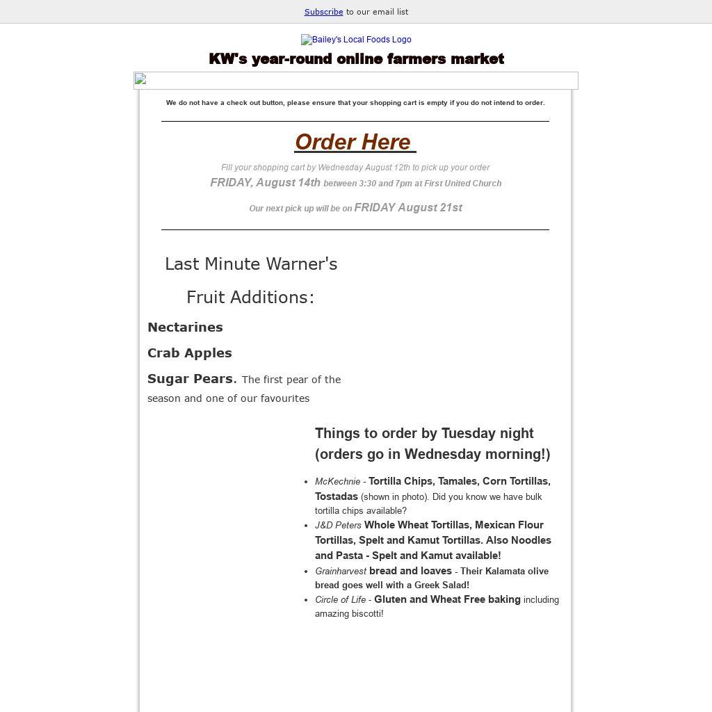 Fill your shopping cart by Wednesday August 12th to pick up your order