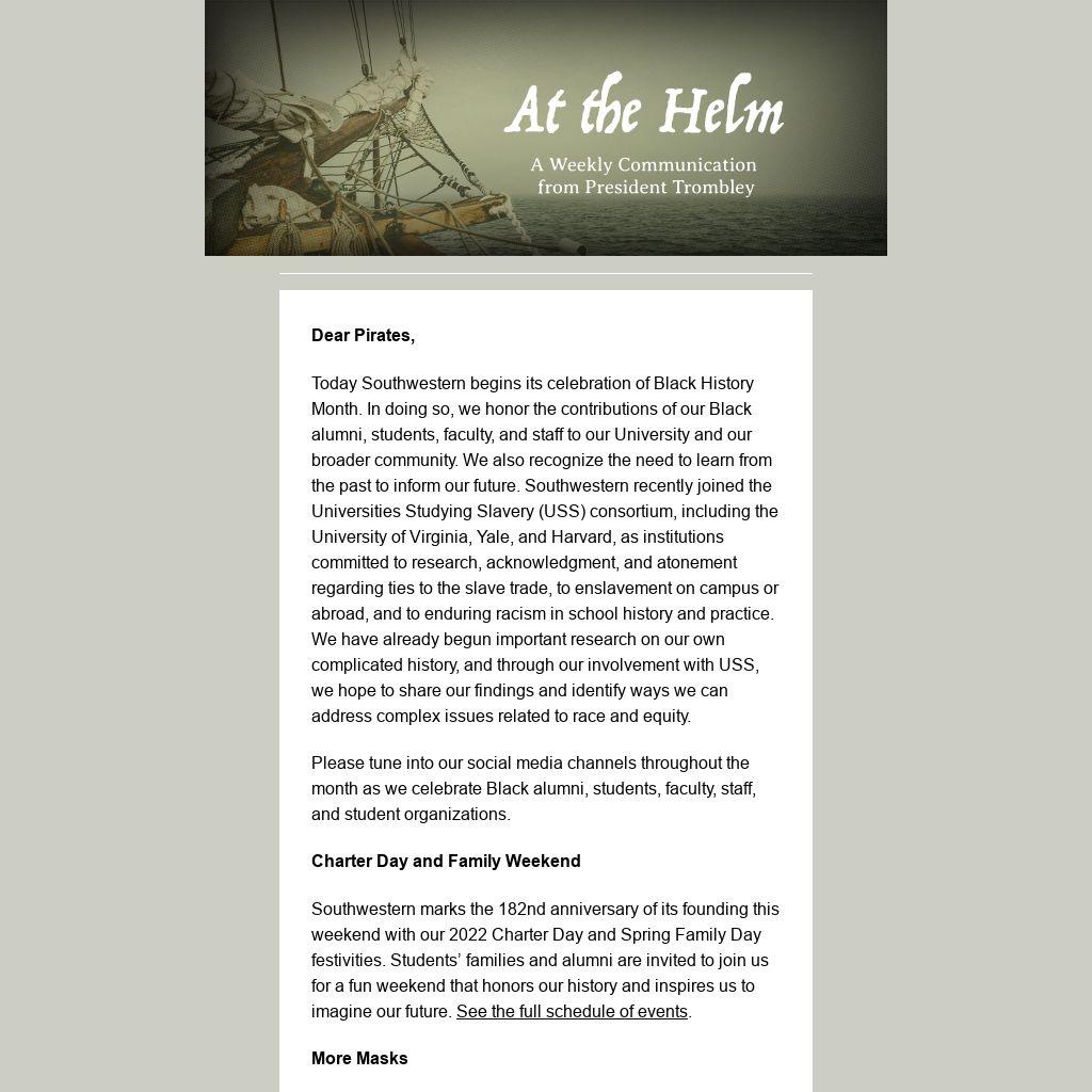 Today Southwestern begins its celebration of Black History Month. In doing so, we honor the contributions of our Black alumni, students, faculty, and staff to our University and our broader community. We also recognize the need to learn from the past to inform our future. Southwestern recently joined the Universities Studying Slavery (USS) consortium, including the University of Virginia, Yale, and Harvard, as institutions committed to research, acknowledgment, and atonement regarding ties to the slave trade, to enslavement on campus or abroad, and to enduring racism in school history and practice. We have already begun important research on our own complicated history, and through our involvement with USS, we hope to share our findings and identify ways we can address complex issues related to race and equity.
