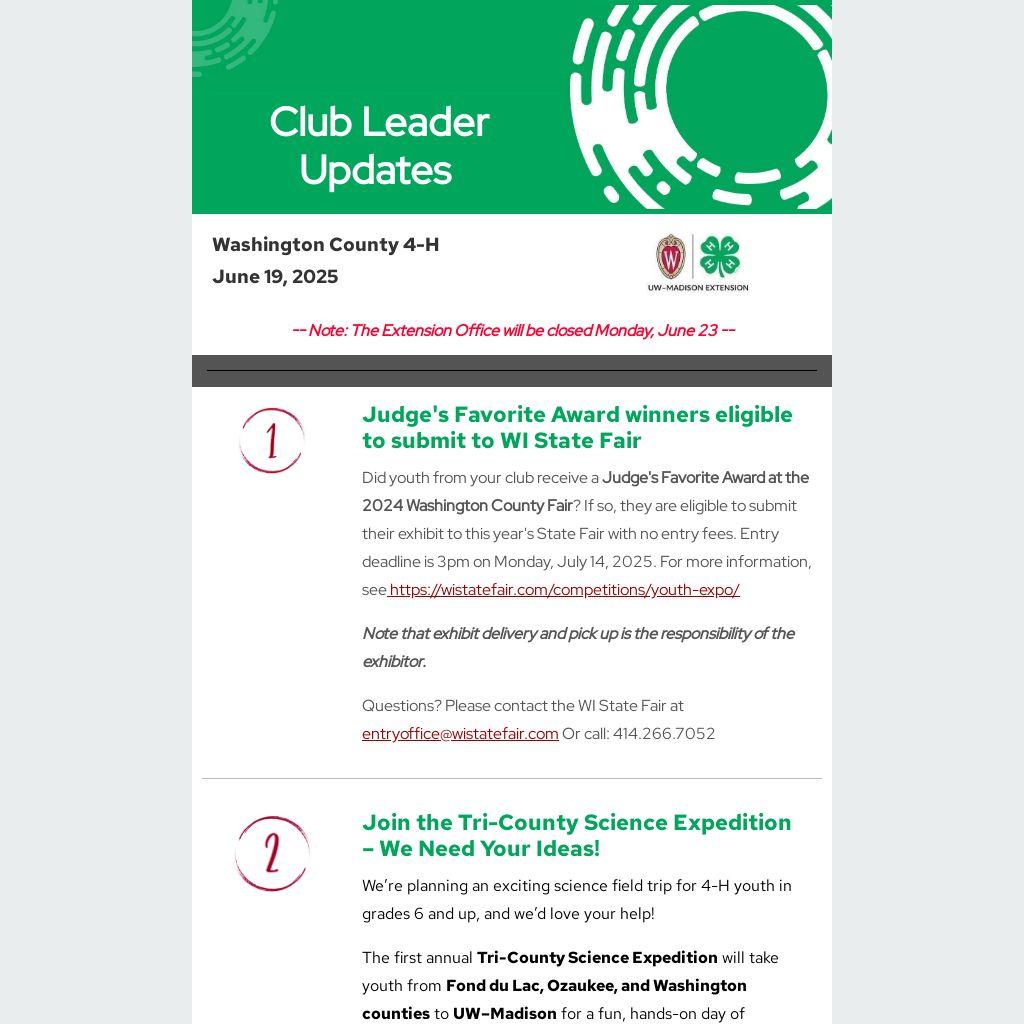 Did youth from your club receive a Judge's Favorite Award at the 2024 Washington County Fair? If so, they are eligible to submit their exhibit to this year's State Fair with no entry fees. Entry deadline is 3pm on Monday, July 14, 2025. For more information, see https://wistatefair.com/competitions/youth-expo/