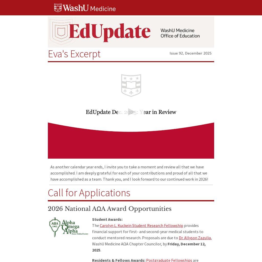 Residents & Fellows Awards: Postgraduate Fellowships are awarded for research or scholarly projects in the spirit of the AΩA mission. Up to 5 projects will each receive a $6,000 award. Applicants must be nominated by their residency or fellowship program director. Notify Dr. Zazulia by Monday, April 27, 2026, if you plan to make a submission.