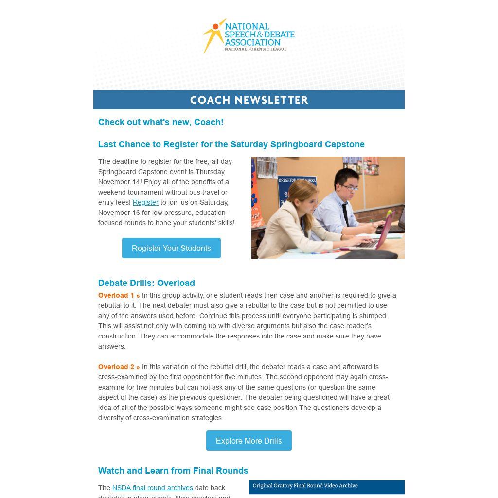 The NSDA final round archives date back decades in older events. New coaches and students can learn about new events by watching the videos, or rounds can be used in classrooms or practice for more advanced students to analyze particular elements or strategies at play.