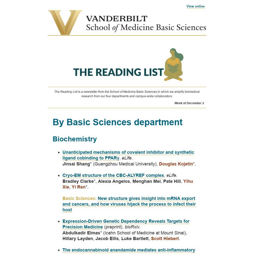 The Reading List is a newsletter from the School of Medicine Basic Sciences in which we amplify biomedical research from our four departments and campus-wide collaborators.