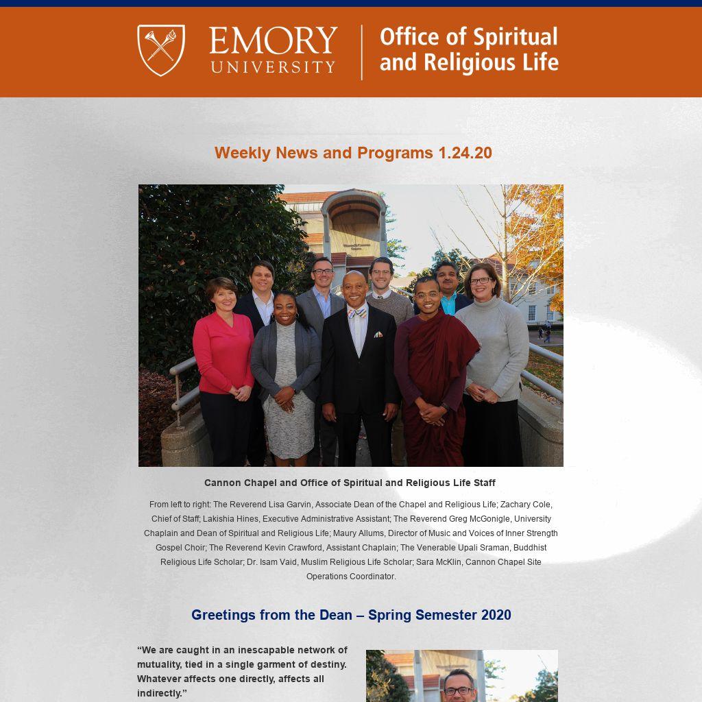 Emory OSRL Enews is published weekly during term by the Emory University Office of Spiritual and Religious Life covering Atlanta-campus programs. For Oxford College spiritual life, please click here. To submit information or to update your preferences, please contact religiouslife@emory.edu.