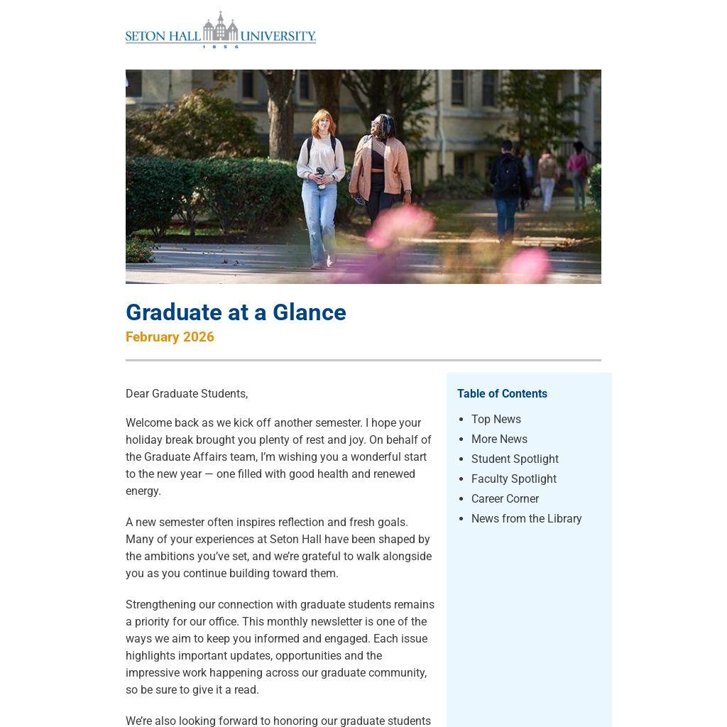 We’re also looking forward to honoring our graduate students during the third annual Graduate Student Appreciation Week, happening April 13-17. This national celebration recognizes the impact graduate students make on campuses across the country. In this month’s newsletter, you’ll find an early look at Seton Hall’s planned events, with a full schedule coming next month. Make sure to save the dates.
