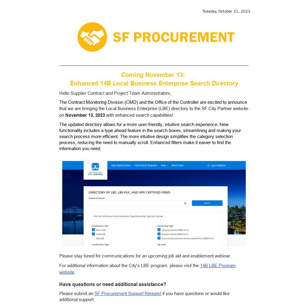 The Contract Monitoring Division (CMD) and the Office of the Controller are excited to announce that we are bringing the Local Business Enterprise (LBE) directory to the SF City Partner website on November 13, 2023 with enhanced search capabilities!