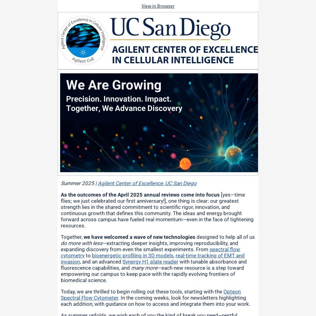 Next steps: Informational demos were conducted during the Grand Opening (April 2025) and additional training sessions can be scheduled for new users. For inquiries or to discuss your high‑dimensional flow needs, please contact the Center (k3perry@health.ucsd.edu).