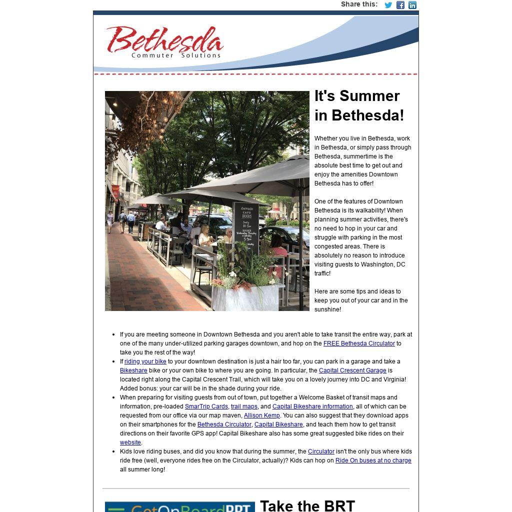 One of the features of Downtown Bethesda is its walkability! When planning summer activities, there's no need to hop in your car and struggle with parking in the most congested areas. There is absolutely no reason to introduce visiting guests to Washington, DC traffic!