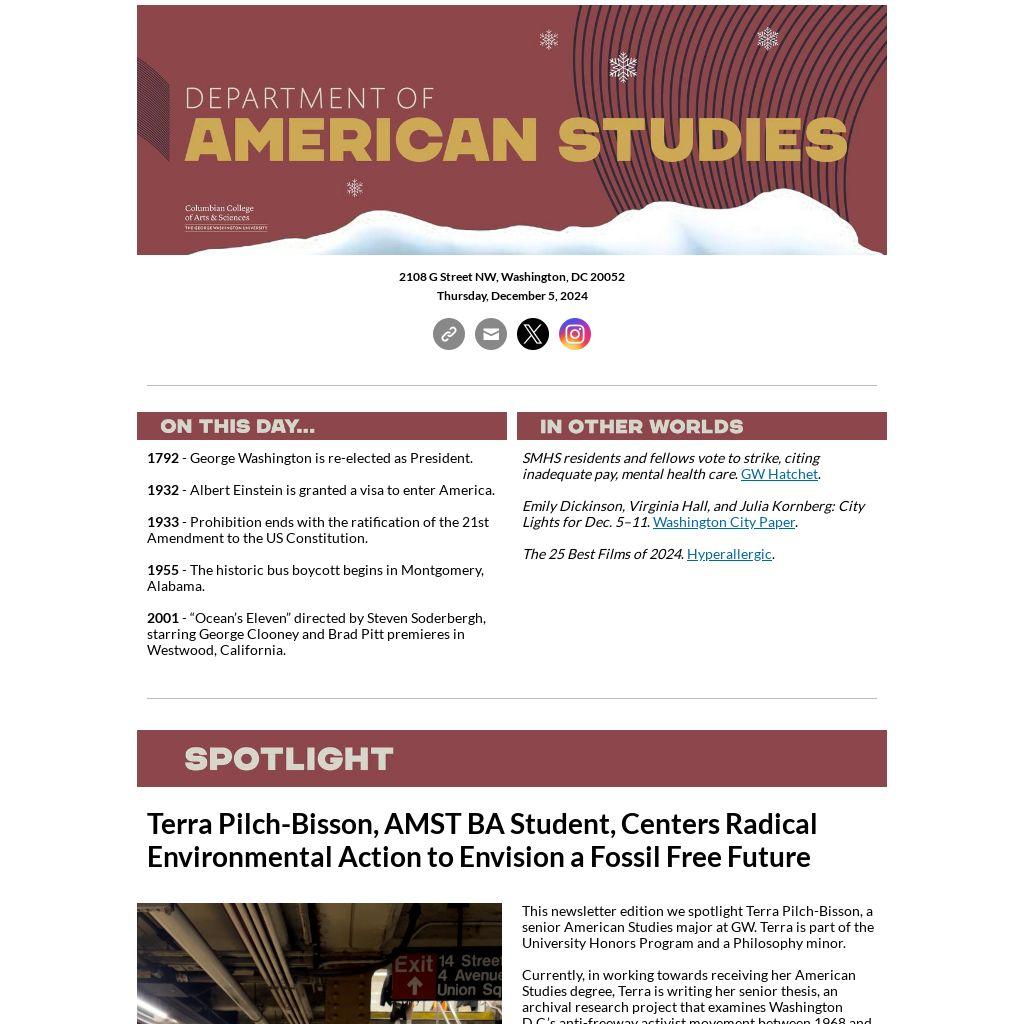 | This newsletter edition we spotlight Terra Pilch-Bisson, a senior American Studies major at GW. Terra is part of the University Honors Program and a Philosophy minor.