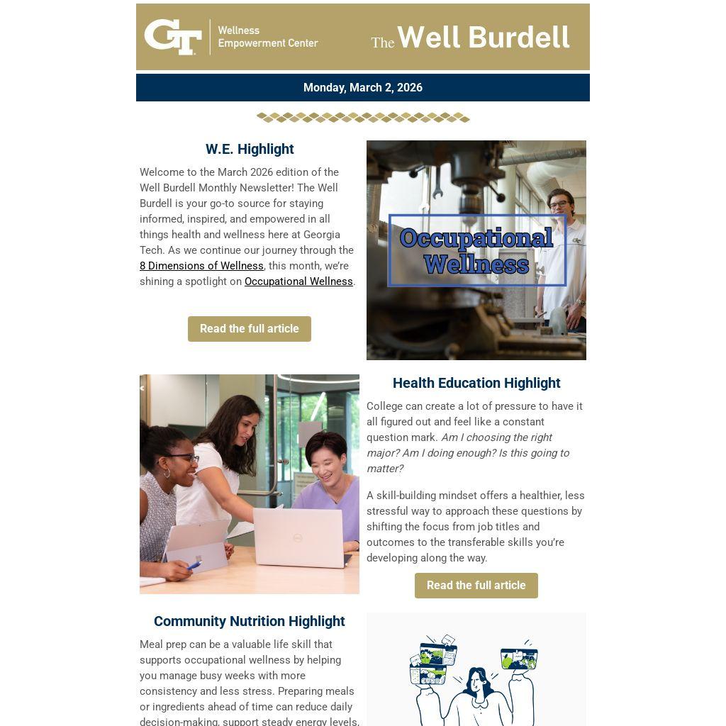 Welcome to the March 2026 edition of the Well Burdell Monthly Newsletter! The Well Burdell is your go-to source for staying informed, inspired, and empowered in all things health and wellness here at Georgia Tech. As we continue our journey through the 8 Dimensions of Wellness, this month, we’re shining a spotlight on Occupational Wellness.