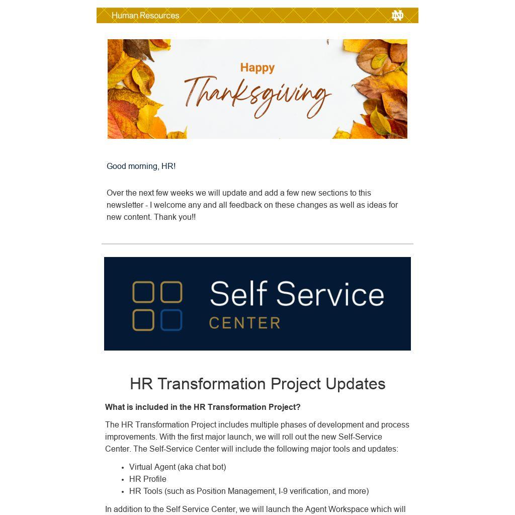 The HR Transformation Project includes multiple phases of development and process improvements. With the first major launch, we will roll out the new Self-Service Center. The Self-Service Center will include the following major tools and updates: