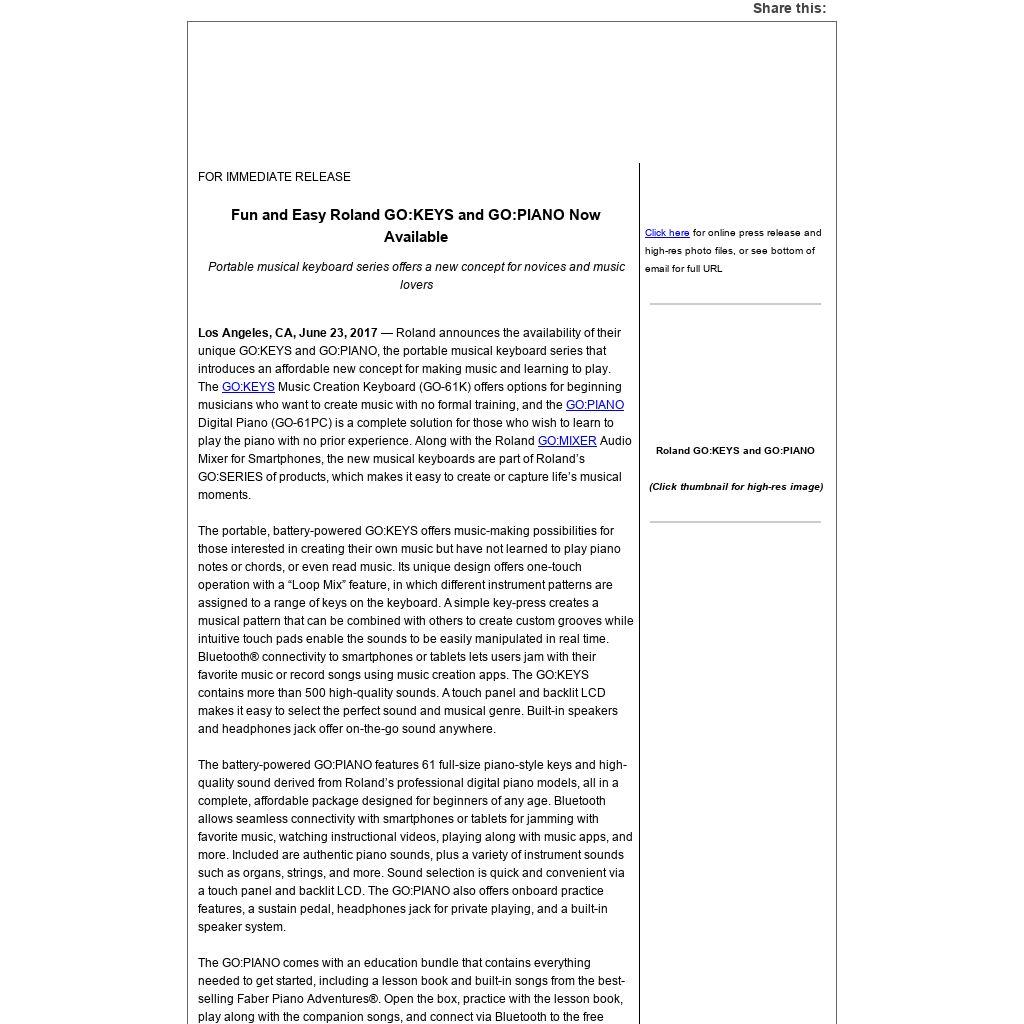 Los Angeles, CA, June 23, 2017 — Roland announces the availability of their unique GO:KEYS and GO:PIANO, the portable musical keyboard series that introduces an affordable new concept for making music and learning to play. The