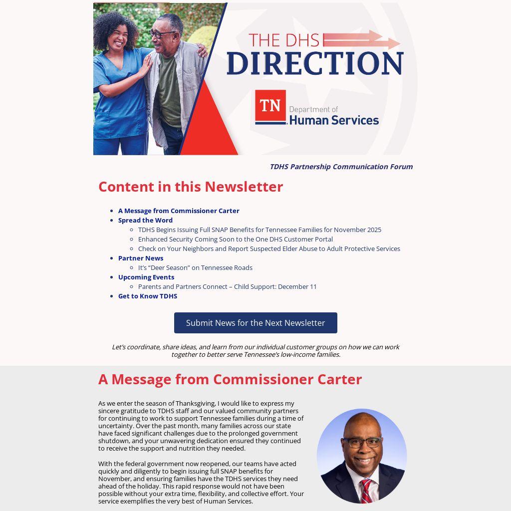 As we enter the season of Thanksgiving, I would like to express my sincere gratitude to TDHS staff and our valued community partners for continuing to work to support Tennessee families during a time of uncertainty. Over the past month, many families across our state have faced significant challenges due to the prolonged government shutdown, and your unwavering dedication ensured they continued to receive the support and nutrition they needed.