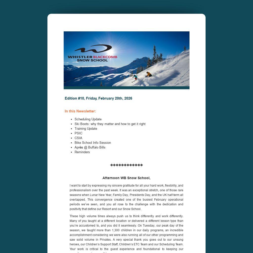 I want to start by expressing my sincere gratitude for all your hard work, flexibility, and professionalism over the past week. It was an exceptional stretch, one of those rare seasons when Lunar New Year, Family Day, Presidents Day, and the UK half-term all overlapped. This convergence created one of the busiest February operational periods we’ve seen, and you all rose to the challenge with the dedication and positivity that define our Resort and our Snow School.