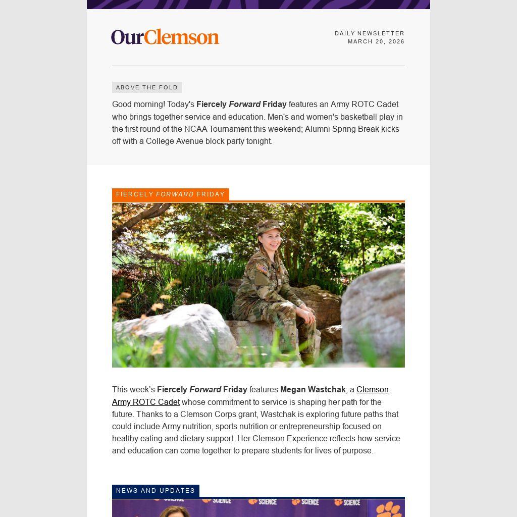 Good morning! Today's Fiercely Forward Friday features an Army ROTC Cadet who brings together service and education. Men's and women's basketball play in the first round of the NCAA Tournament this weekend; Alumni Spring Break kicks off with a College Avenue block party tonight.