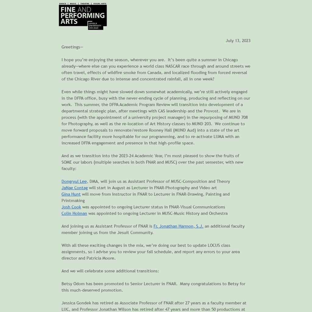 Jessica Gondek has retired as Associate Professor of FNAR after 27 years as a faculty member at LUC, and Professor Jonathan Wilson has retired after 47 years and more than 50 productions at LUC. Join me in celebrating both of their long tenures at LUC, and their myriad contributions to our Department, to generations of students, and to the field in general.