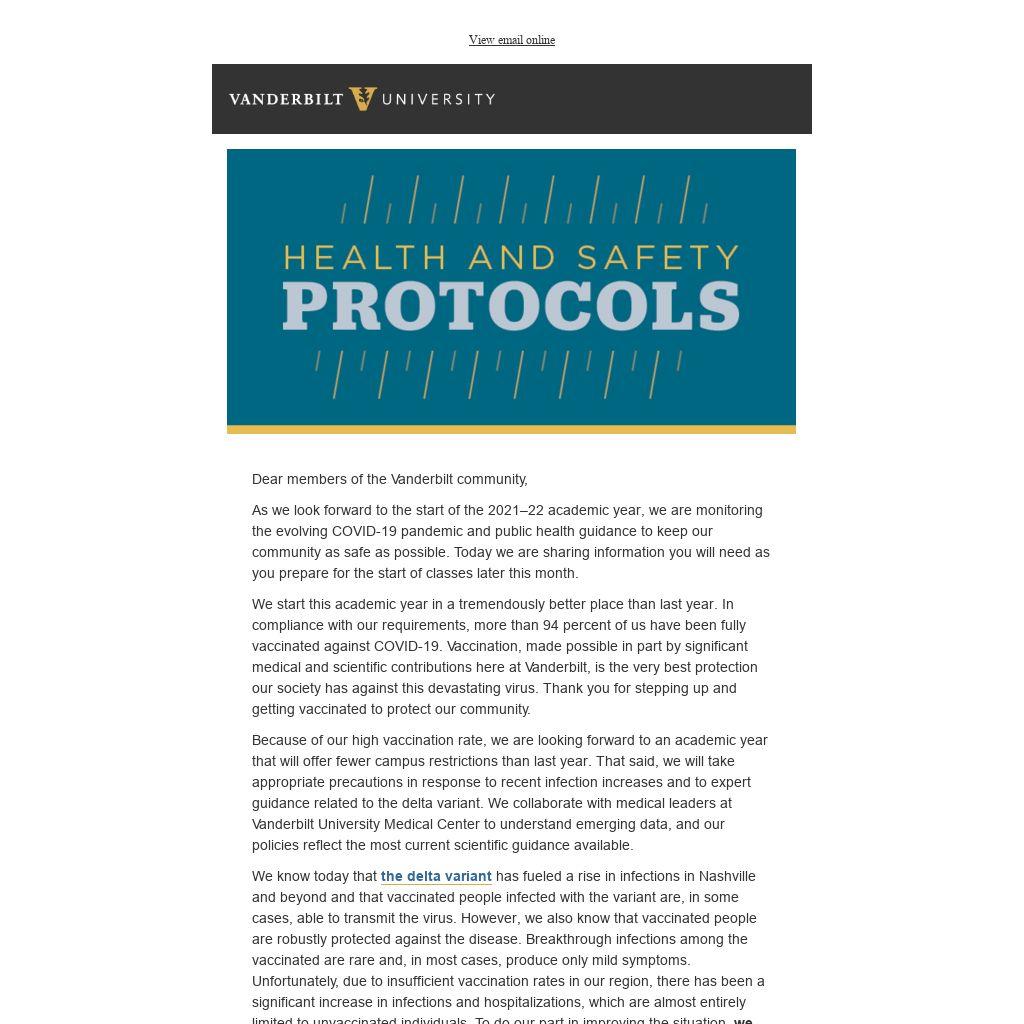 Because of our high vaccination rate, we are looking forward to an academic year that will offer fewer campus restrictions than last year. That said, we will take appropriate precautions in response to recent infection increases and to expert guidance related to the delta variant. We collaborate with medical leaders at Vanderbilt University Medical Center to understand emerging data, and our policies reflect the most current scientific guidance available.
