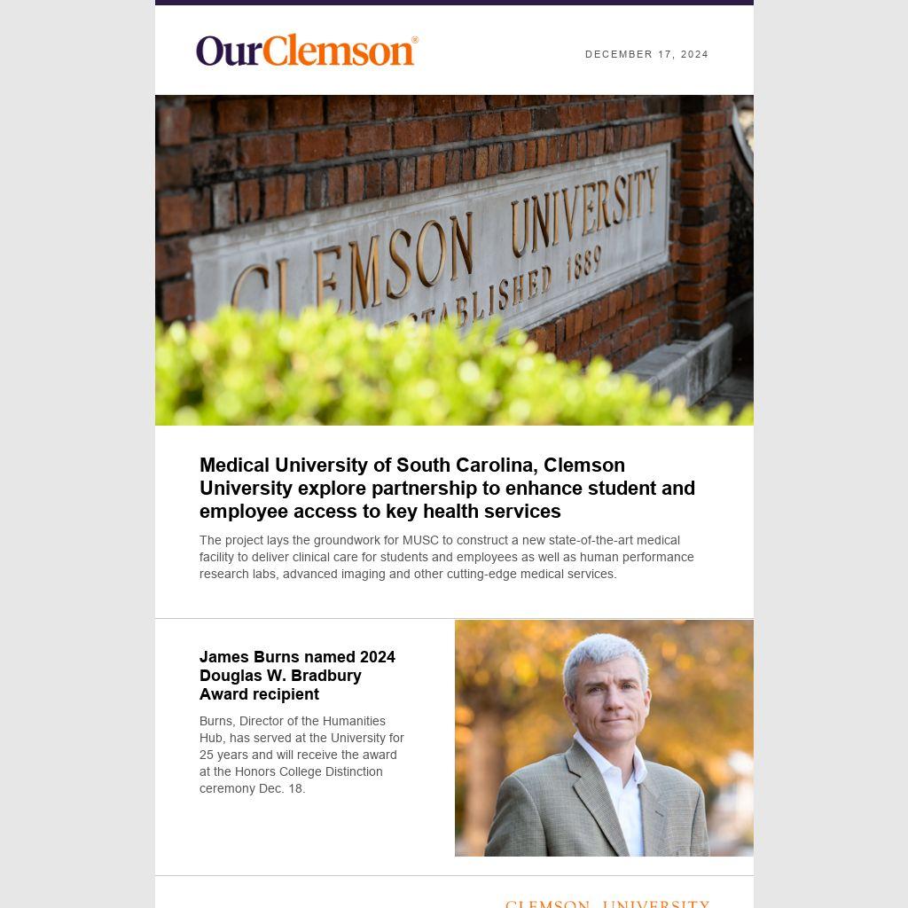 Nominations remain open for the Martin Luther King Jr. Awards for Excellence in Service. Awards are given annually to a Clemson student, employee and community member. The deadline to submit nominations is Tuesday, December 31.