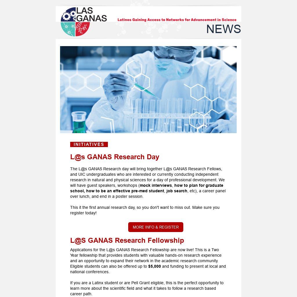 The L@s GANAS Research day will bring together L@s GANAS Research Fellows, and UIC undergraduates who are interested or currently conducting independent research in natural and physical sciences for a day of professional development. We will have guest speakers, workshops (mock interviews, how to plan for graduate school, how to be an effective pre-med student, job search, etc), a career panel over lunch, and end in a poster session.