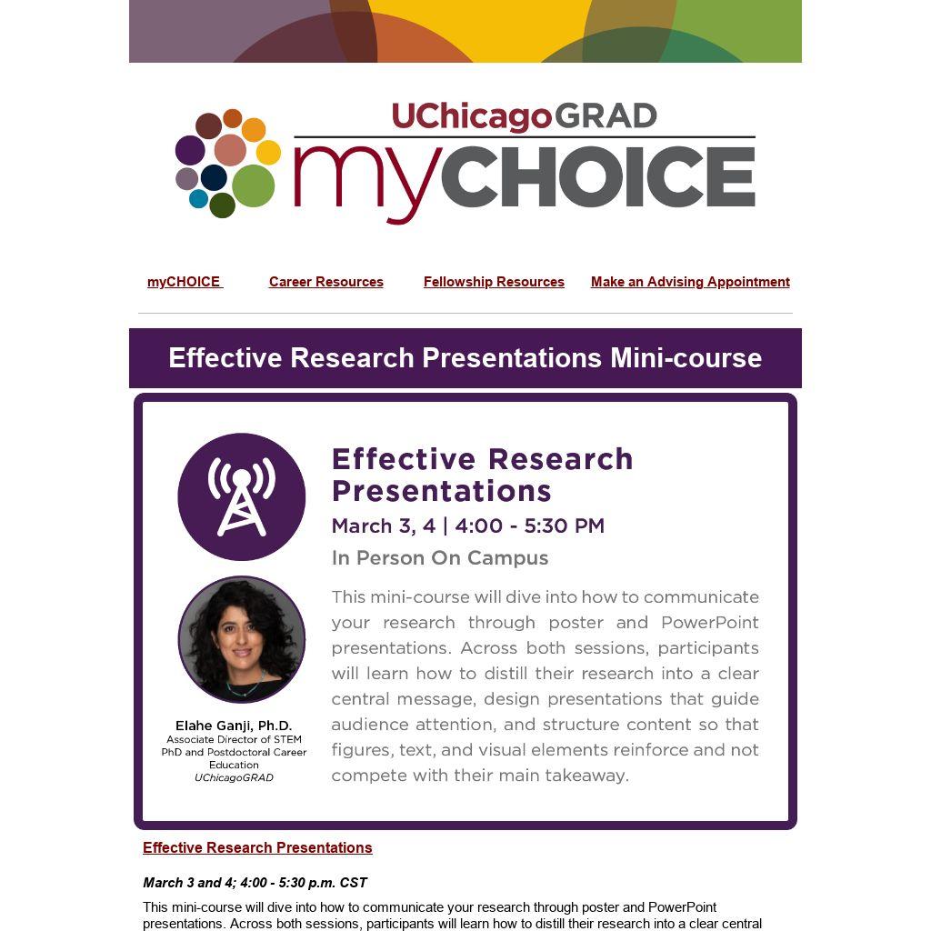 myCHOICE is offering its Science Policy Trek to Washington D.C. Trainees will be selected to travel to Washington D.C. for several days of site visits at federal offices and non-governmental organizations, where they will learn about policy-related positions for PhD-trained scientists. Confirmed site visits include National Institutes of Health, UChicago Office of Federal Relations, Capitol Hill Visit, and a reception with D.C. Area UChicago alumni.