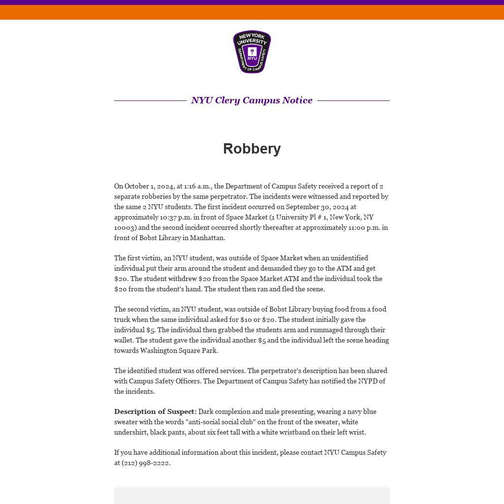 On October 1, 2024, at 1:16 a.m., the Department of Campus Safety received a report of 2 separate robberies by the same perpetrator. The incidents were witnessed and reported by the same 2 NYU students. The first incident occurred on September 30, 2024 at approximately 10:37 p.m. in front of Space Market (1 University Pl # 1, New York, NY 10003) and the second incident occurred shortly thereafter at approximately 11:00 p.m. in front of Bobst Library in Manhattan.