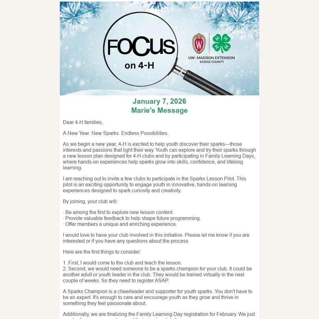 As we begin a new year, 4-H is excited to help youth discover their sparks—those interests and passions that light their way. Youth can explore and try their sparks through a new lesson plan designed for 4-H clubs and by participating in Family Learning Days, where hands-on experiences help sparks grow into skills, confidence, and lifelong learning.