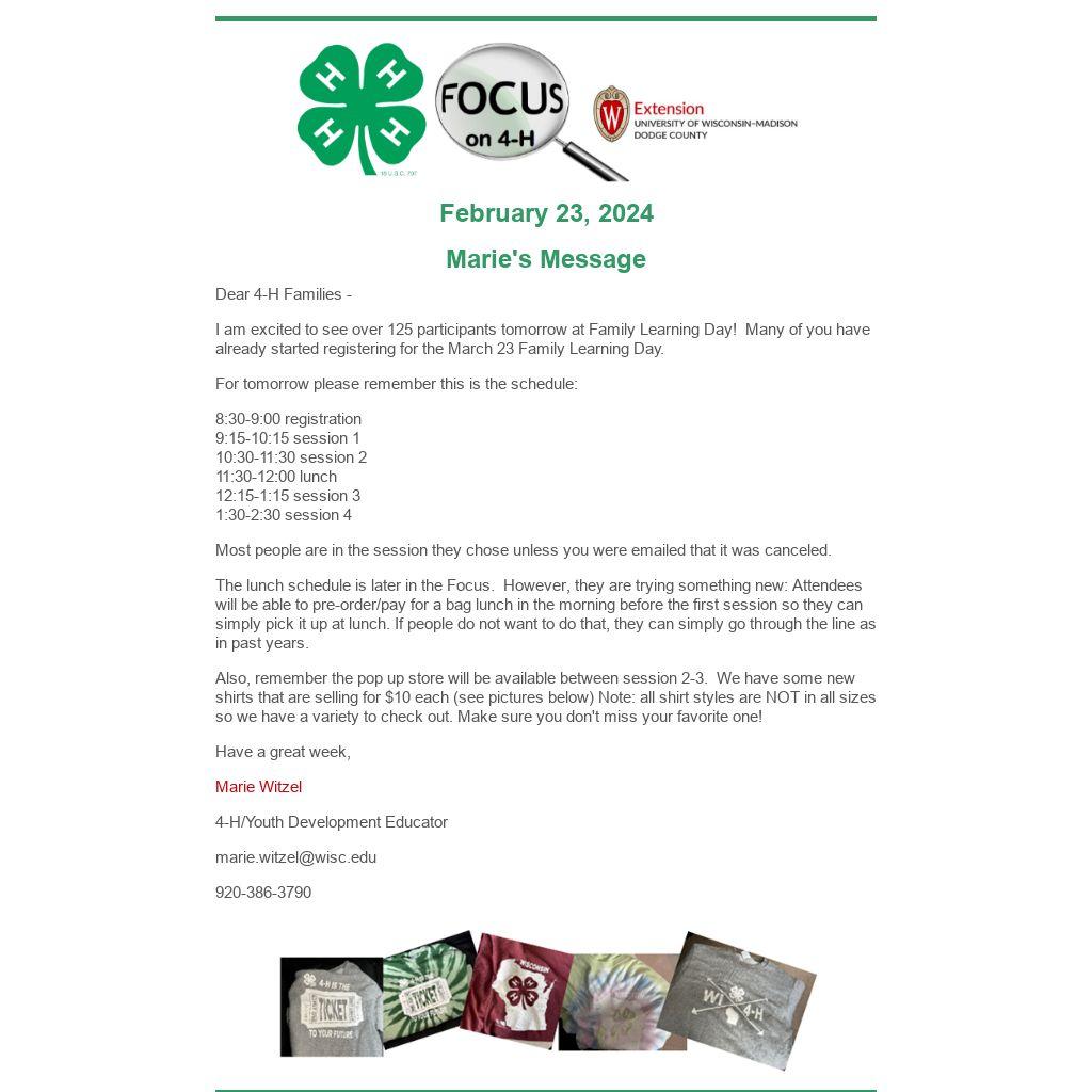 If clubs or groups have items to share, send them by noon on Thursday to be included in that week’s issue. Anything received after 12 p.m. Thursday will be considered for the following week. The articles should be sent to Marie at marie.witzel@wisc.edu. You can also contact the office with any questions. Thanks!