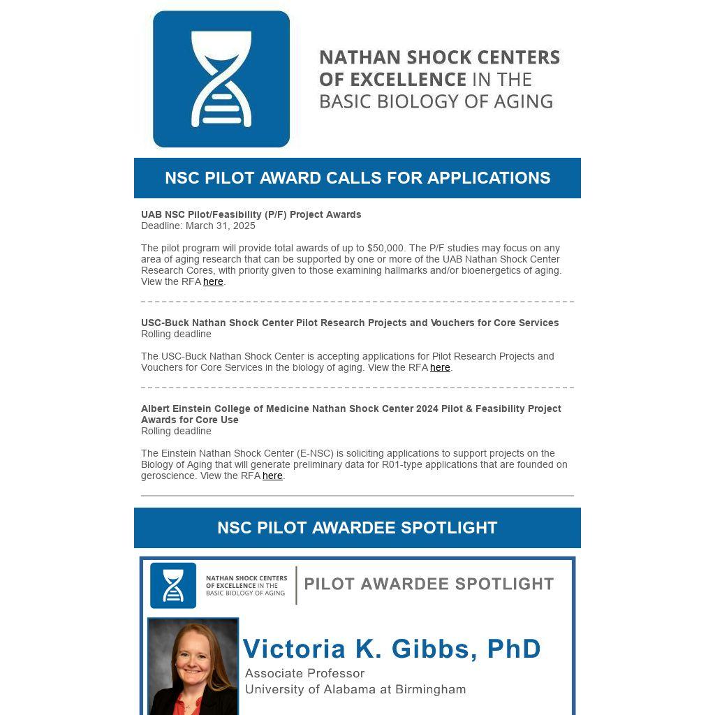 In conjunction with the 2025 AGE Annual Meeting, the NSC Director's Symposium will take place on May 11, 2025 at the Dena'ina Civic and Convention Center in Anchorage, Alaska, featuring pilot grantee presentations out of each of the eight Nathan Shock Centers.