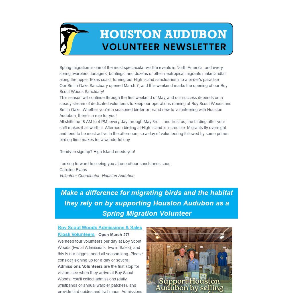 This season will continue through the first weekend of May, and our success depends on a steady stream of dedicated volunteers to keep our operations running at Boy Scout Woods and Smith Oaks. Whether you're a seasoned birder or brand new to volunteering with Houston Audubon, there's a role for you!