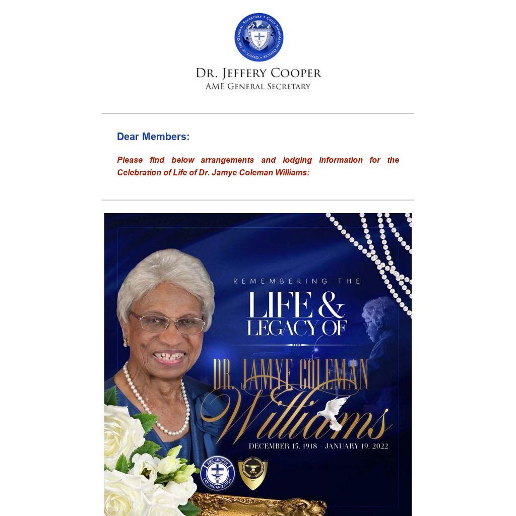 Please find below arrangements and lodging information for the Celebration of Life of Dr. Jamye Coleman Williams: