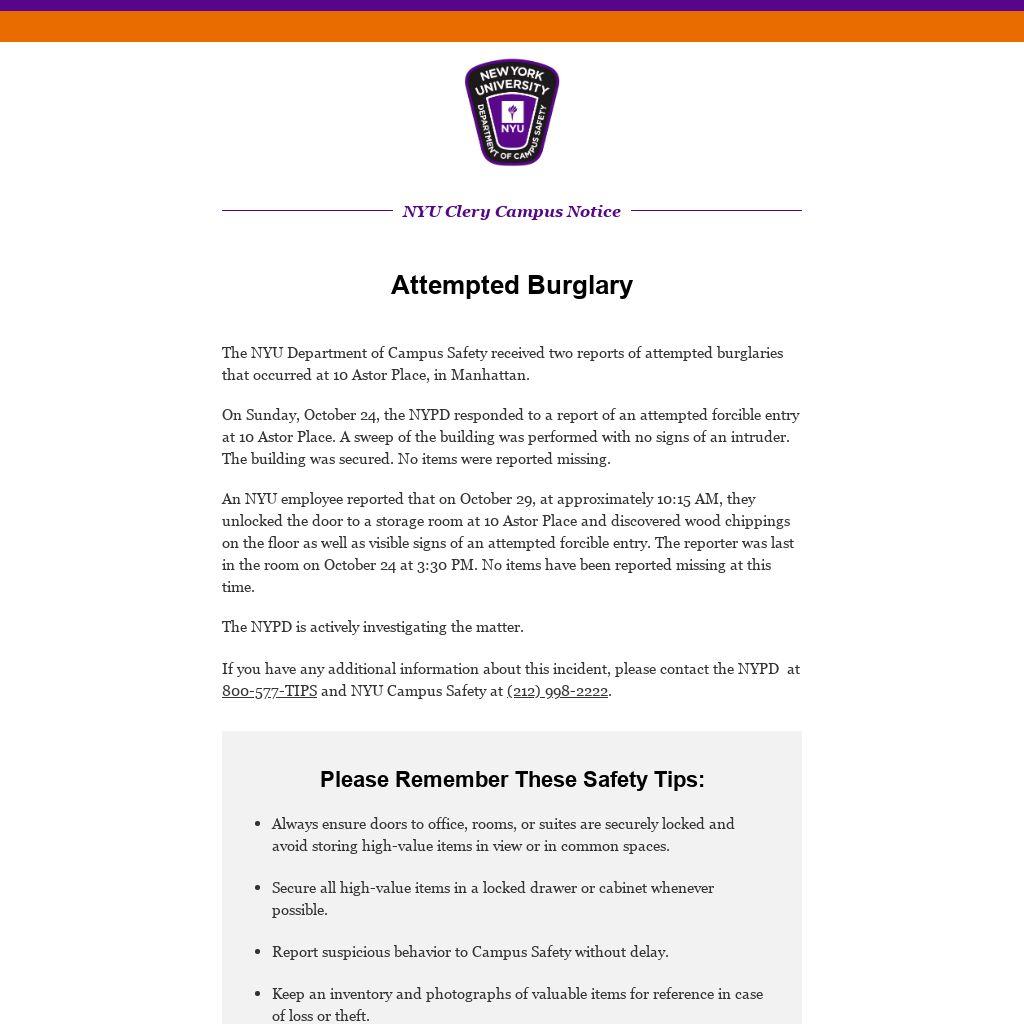 The NYU Department of Campus Safety received two reports of attempted burglaries that occurred at 10 Astor Place, in Manhattan.