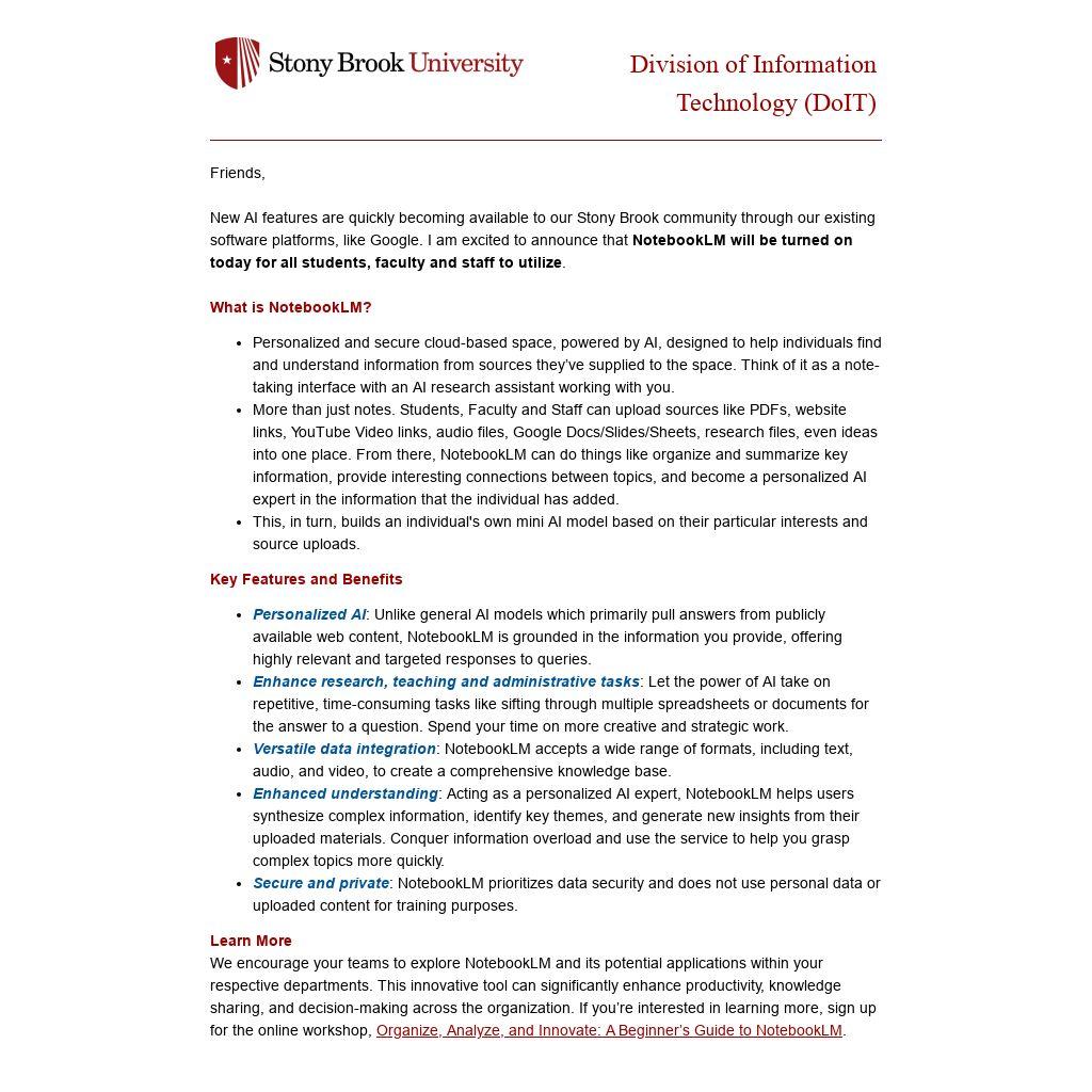 New AI features are quickly becoming available to our Stony Brook community through our existing software platforms, like Google. I am excited to announce that NotebookLM will be turned on today for all students, faculty and staff to utilize.
