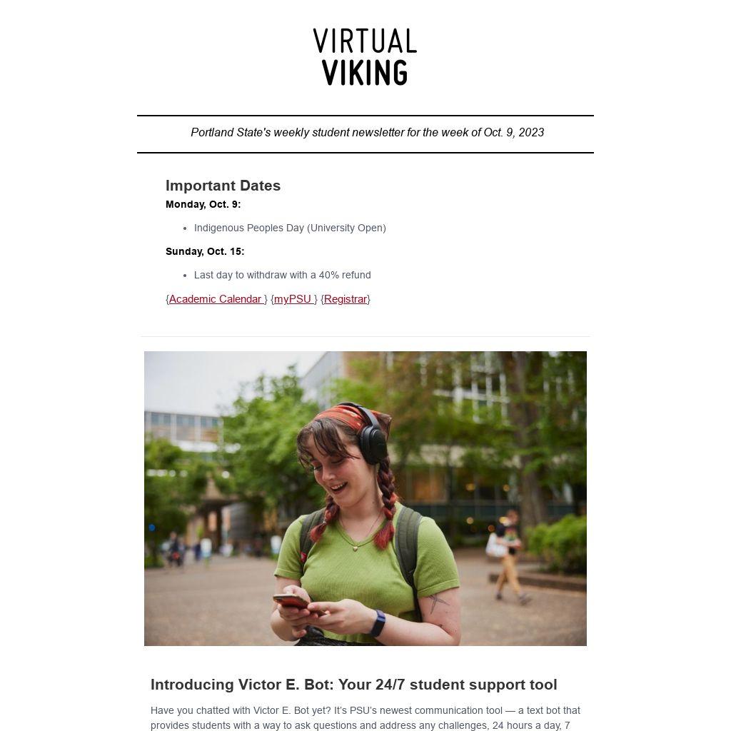 Have you chatted with Victor E. Bot yet? It’s PSU’s newest communication tool — a text bot that provides students with a way to ask questions and address any challenges, 24 hours a day, 7 days a week. Victor E. Bot sent enrolled students a text message on Oct. 5. Add the number to your contacts or if you don’t want to interact with the text bot, you can opt-out by replying STOP or #pause.