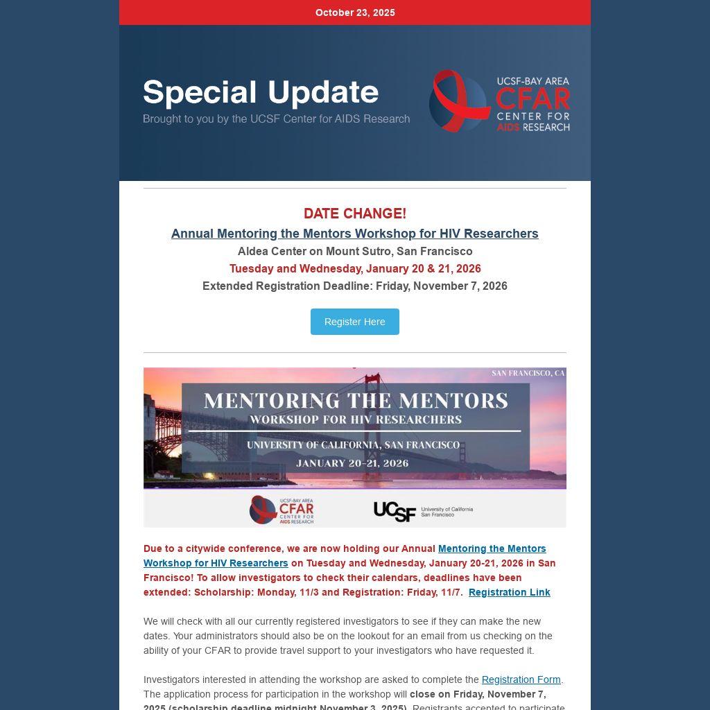 Due to a citywide conference, we are now holding our Annual Mentoring the Mentors Workshop for HIV Researchers on Tuesday and Wednesday, January 20-21, 2026 in San Francisco! To allow investigators to check their calendars, deadlines have been extended: Scholarship: Monday, 11/3 and Registration: Friday, 11/7. Registration Link
