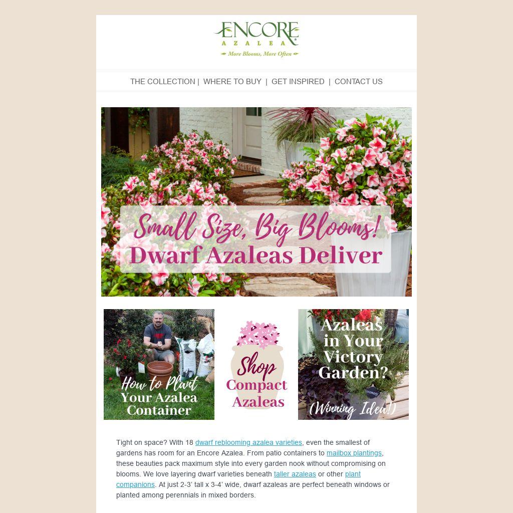 Tight on space? With 18 dwarf reblooming azalea varieties, even the smallest of gardens has room for an Encore Azalea. From patio containers to mailbox plantings, these beauties pack maximum style into every garden nook without compromising on blooms. We love layering dwarf varieties beneath taller azaleas or other plant companions. At just 2-3’ tall x 3-4’ wide, dwarf azaleas are perfect beneath windows or planted among perennials in mixed borders.