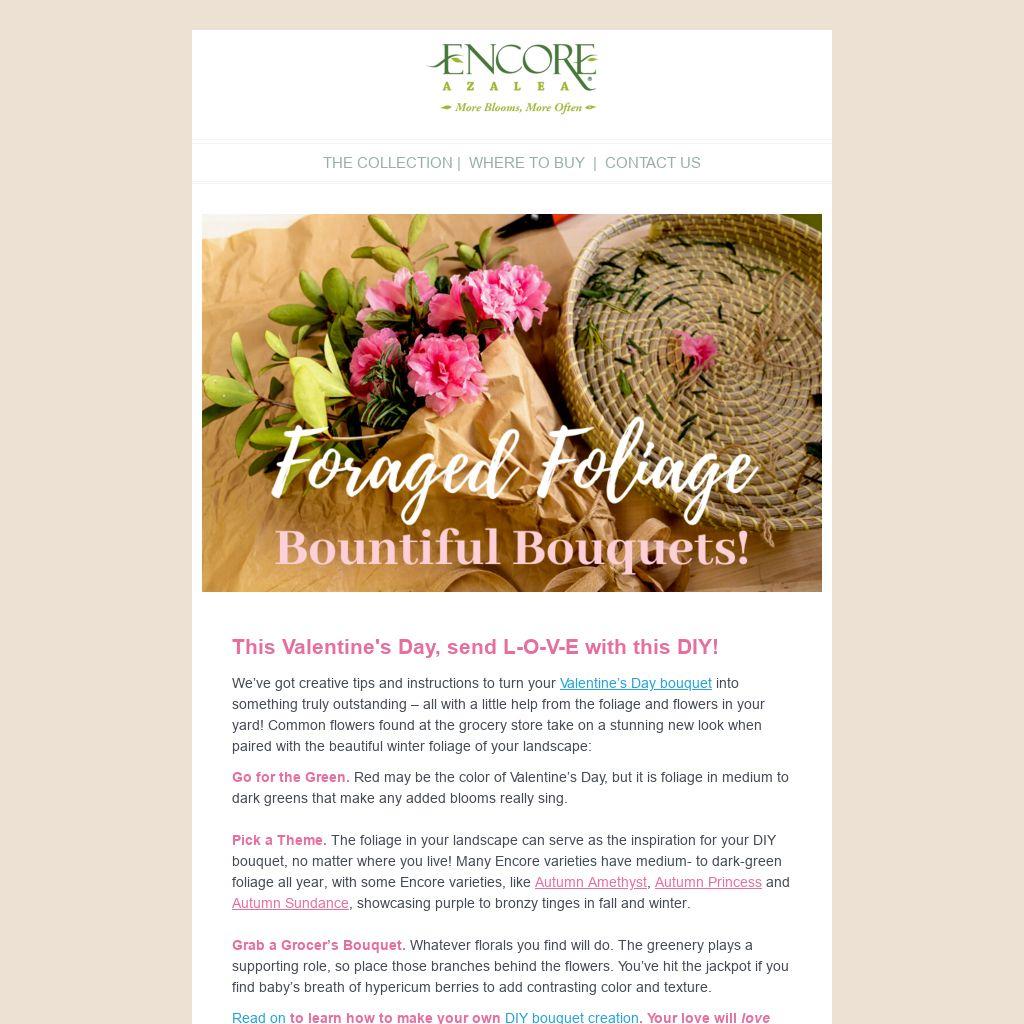 Pick a Theme. The foliage in your landscape can serve as the inspiration for your DIY bouquet, no matter where you live! Many Encore varieties have medium- to dark-green foliage all year, with some Encore varieties, like Autumn Amethyst, Autumn Princess and Autumn Sundance, showcasing purple to bronzy tinges in fall and winter.