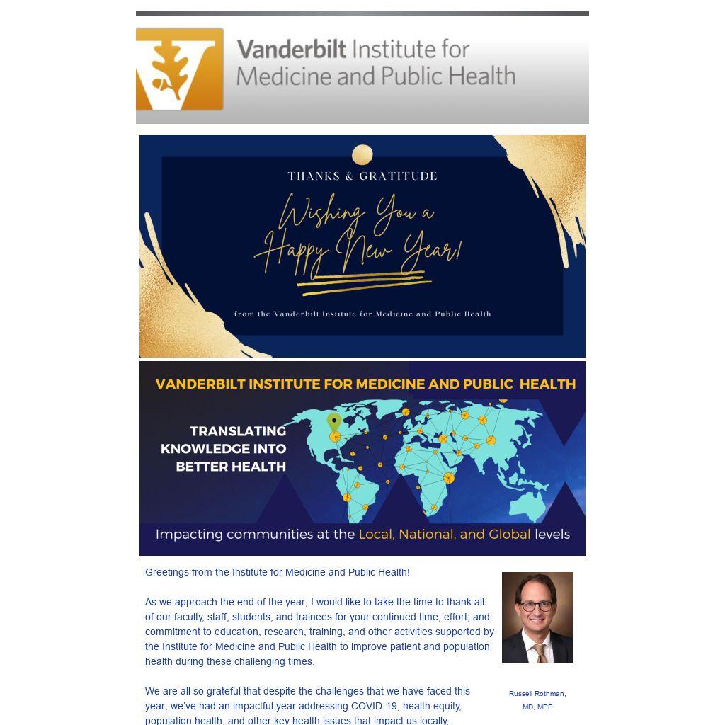 | Vanderbilt Institute for Medicine and Public Health Vanderbilt University Medical Center 2525 West End Ave | Suite 1200 | Nashville, TN 37203 imph@vumc.org www.vumc.org/medicine-public-health @VUMC_IMPH