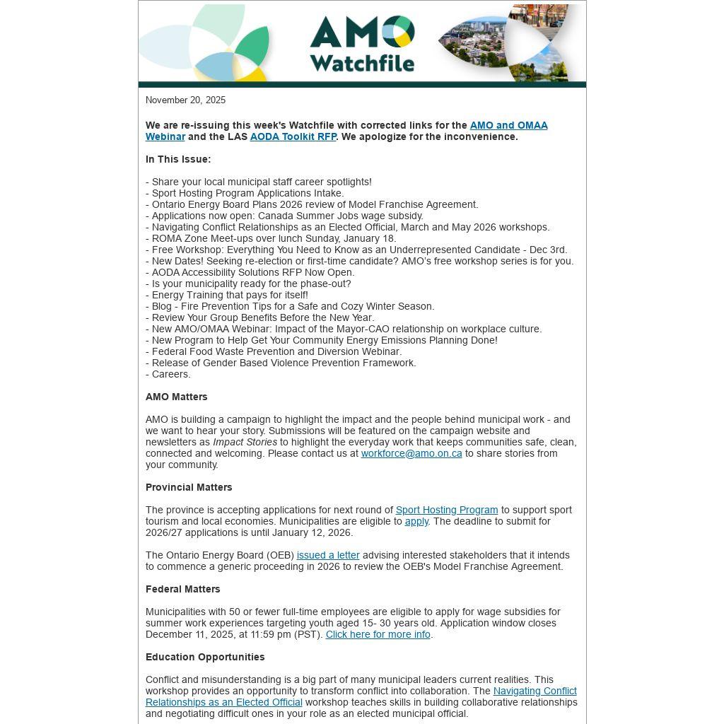 We are re-issuing this week's Watchfile with corrected links for the AMO and OMAA Webinar and the LAS AODA Toolkit RFP. We apologize for the inconvenience.