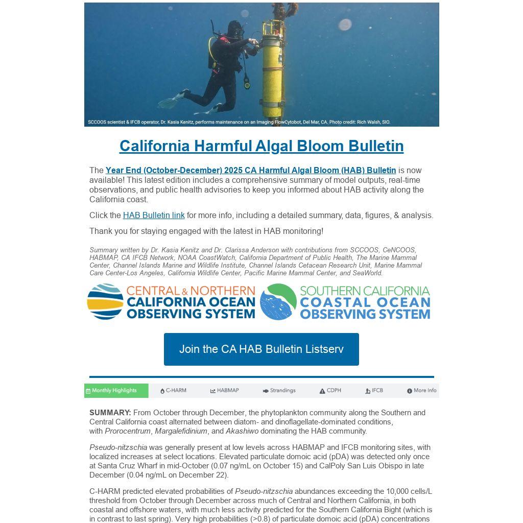 ANIMAL IMPACTS: Marine mammal strandings associated with suspected DA exposure remained low during this period, with 15 cases reported across Southern and Central California, the majority of which are believed to reflect chronic rather than acute exposure.