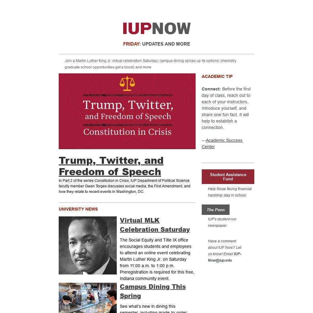Distributed to IUP employees and students four days a week, IUP Now is the official newsletter of Indiana University of Pennsylvania. It features news from across the IUP website, compiled by the Division of Marketing and Communications. Find out how to get your news and events in IUP Now.