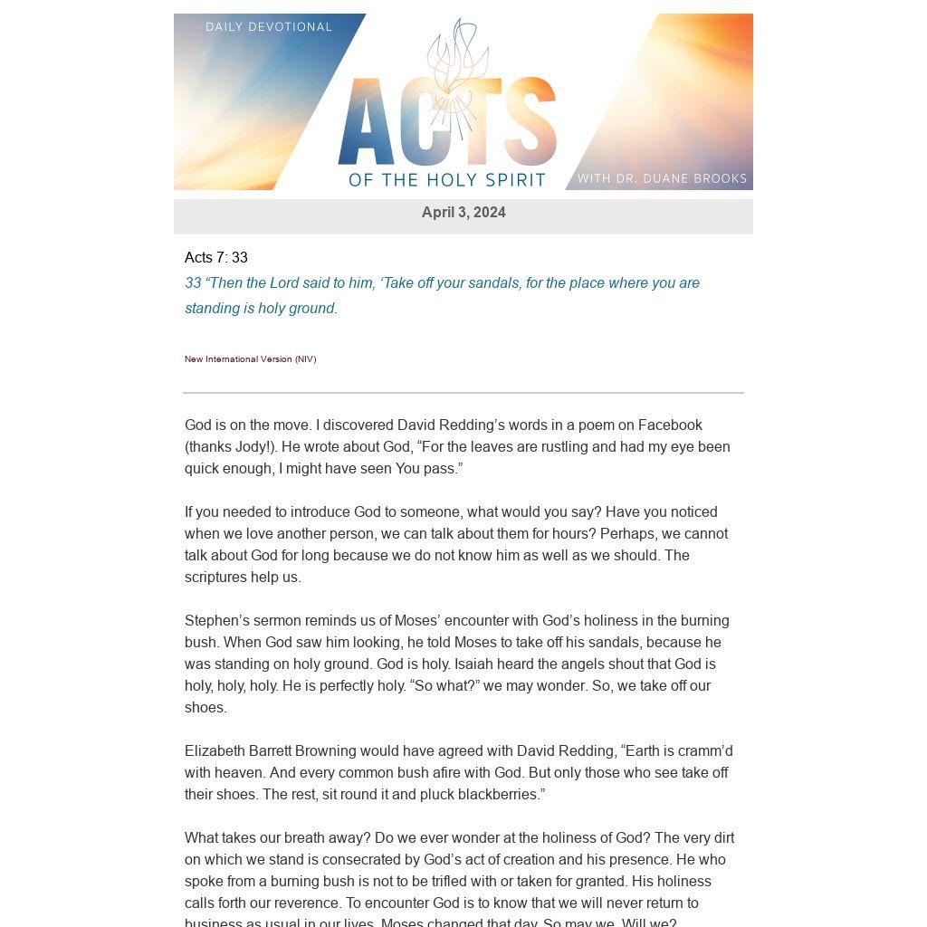 Stephen’s sermon reminds us of Moses’ encounter with God’s holiness in the burning bush. When God saw him looking, he told Moses to take off his sandals, because he was standing on holy ground. God is holy. Isaiah heard the angels shout that God is holy, holy, holy. He is perfectly holy. “So what?” we may wonder. So, we take off our shoes.