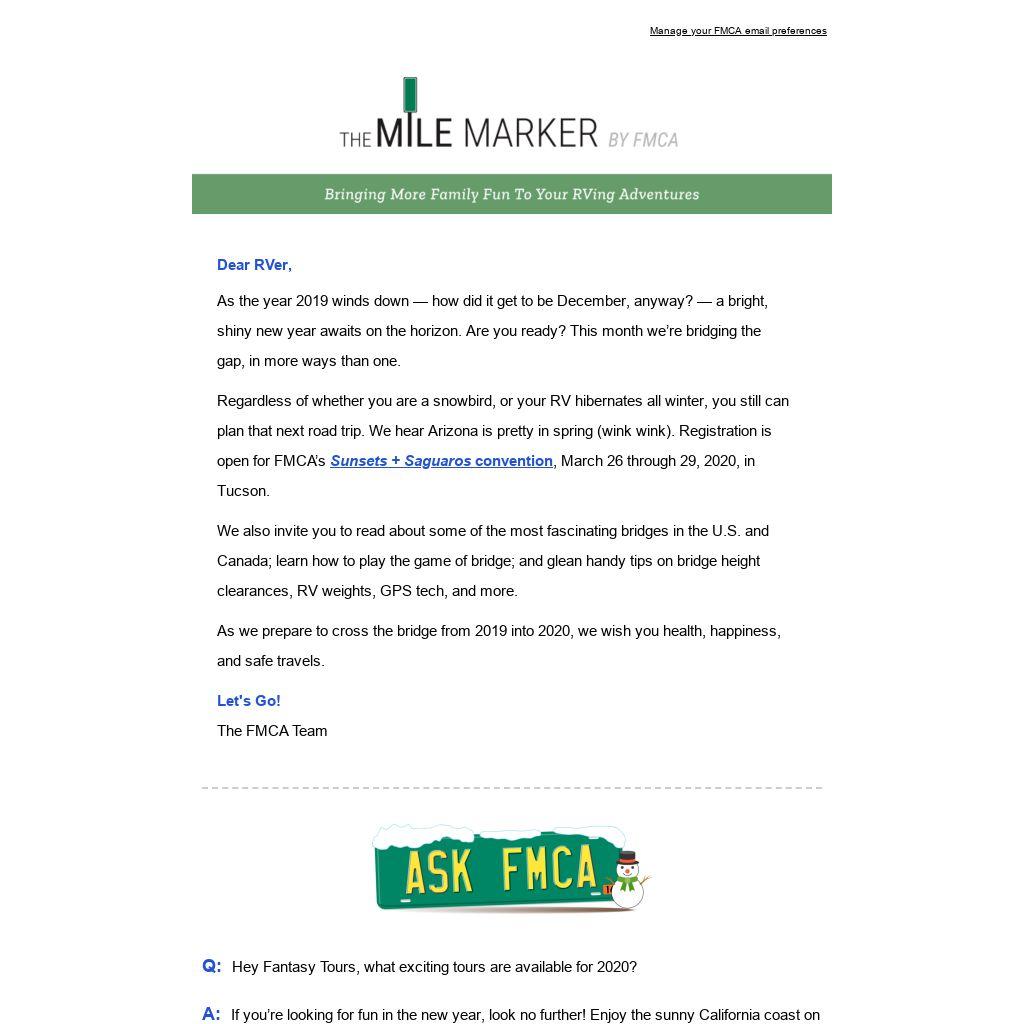 Regardless of whether you are a snowbird, or your RV hibernates all winter, you still can plan that next road trip. We hear Arizona is pretty in spring (wink wink). Registration is open for FMCA’s Sunsets + Saguaros convention, March 26 through 29, 2020, in Tucson.