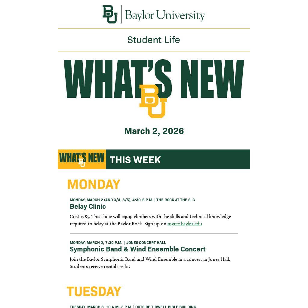 If you are a department or Baylor student organization and have items you would like to see appear in What's New BU, submit them for consideration by Friday at 8 a.m. by clicking here or emailing them to whatsnew@baylor.edu. View past issues of What’s New BU here.