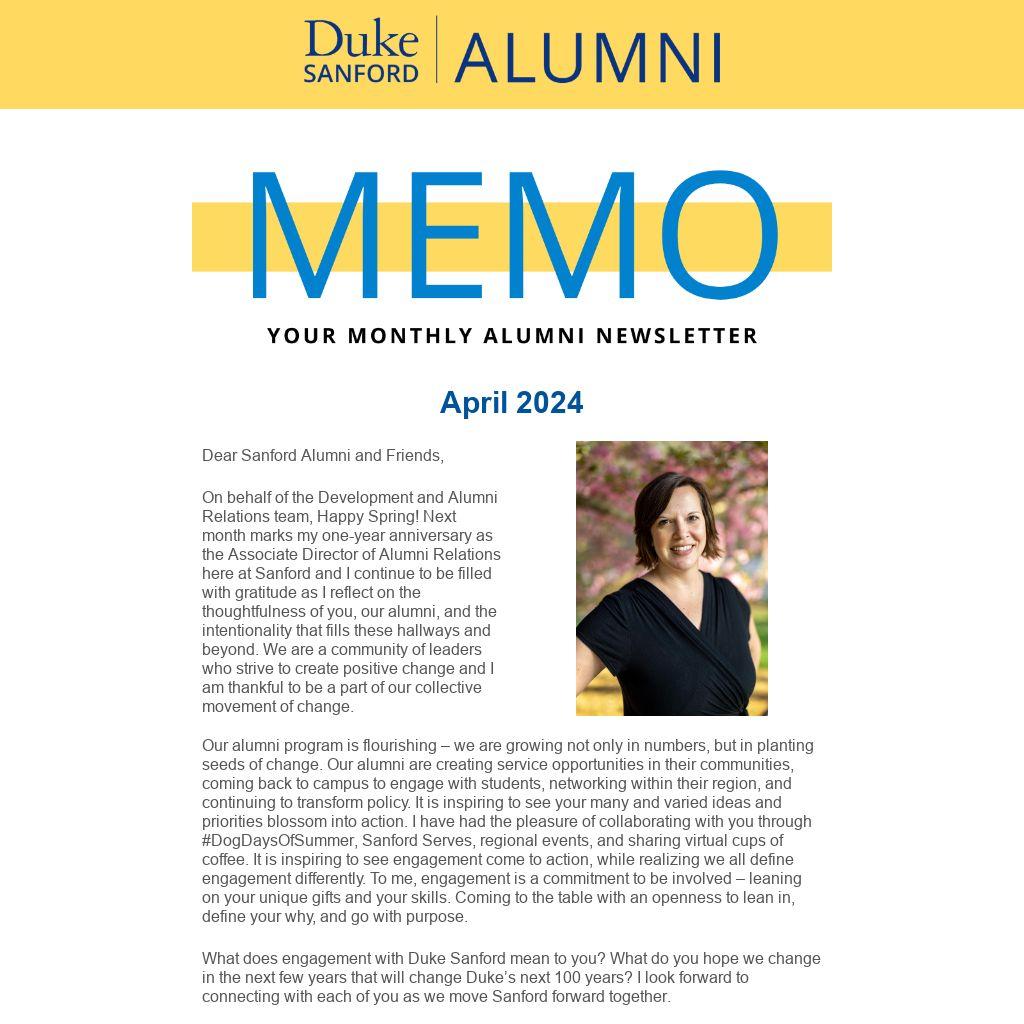 What does engagement with Duke Sanford mean to you? What do you hope we change in the next few years that will change Duke’s next 100 years? I look forward to connecting with each of you as we move Sanford forward together.