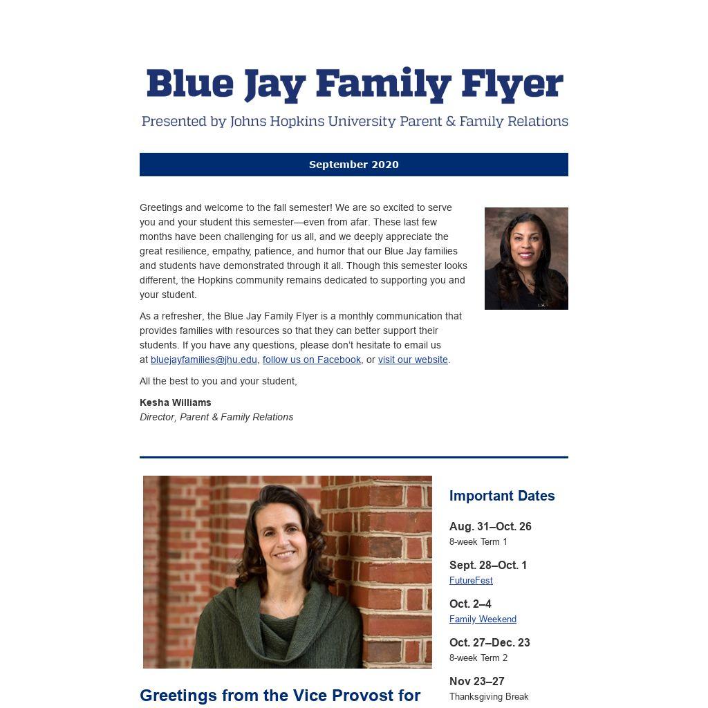 Greetings and welcome to the fall semester! We are so excited to serve you and your student this semester—even from afar. These last few months have been challenging for us all, and we deeply appreciate the great resilience, empathy, patience, and humor that our Blue Jay families and students have demonstrated through it all. Though this semester looks different, the Hopkins community remains dedicated to supporting you and your student.
