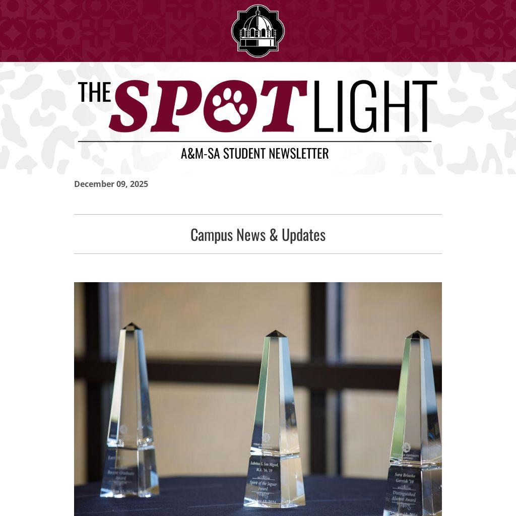 The Spotlight is the campus newsletter for the students of Texas A&M-San Antonio. The Spotlight is published every Tuesday from the start of the semester, providing insight into A&M-SA news, events, and announcements. If you would like to promote a University-wide event or announcement in The Spotlight, submit this form by 5 p.m. CT on a Monday the week before publication.